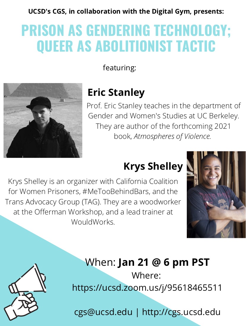 Critical Gender Studies, in collaboration with the Digital Gym, is excited to kick off winter quarter with another "Materializing Abolition: Queer and Feminist Strategies" event! On January 21 at 6 pm we will be joined by Prof. Eric Stanley and Krys Shelley, both active in queer liberation and anti-prison struggles. This month's conversation centers on "Prison as Gendering Technology; Queer as Abolitionist Tactic." We will explore ways in which systems of policing and incarceration are produced by, and forcibly produce, heteronormative gender binaries, and how queer activism sheds light on how we can mobilize a politics of care. We look forward to seeing you there!
