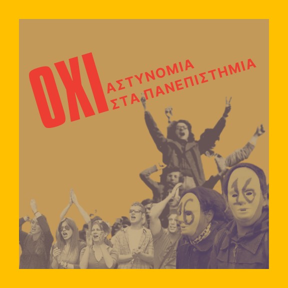 Greek Universities have been off-limits to the Greek military and police forces since 1974, following the military dictatorship's murderous armed attack on the Athens Polytechnic University Uprising in November of the previous year and its subsequent implosion. The current Mitsotakis right-wing government is aiming to re-introduce special police forces on to university campuses, a plan that is broadly opposed by students, staff, instructors and administrators. The Initiative of Academics: NO POLICE ON CAMPUS is distributing a petition opposing the reintroduction of pigs to universities, signed by over 1000 Greek academics, and is requesting that academics from around the world sign the petition.