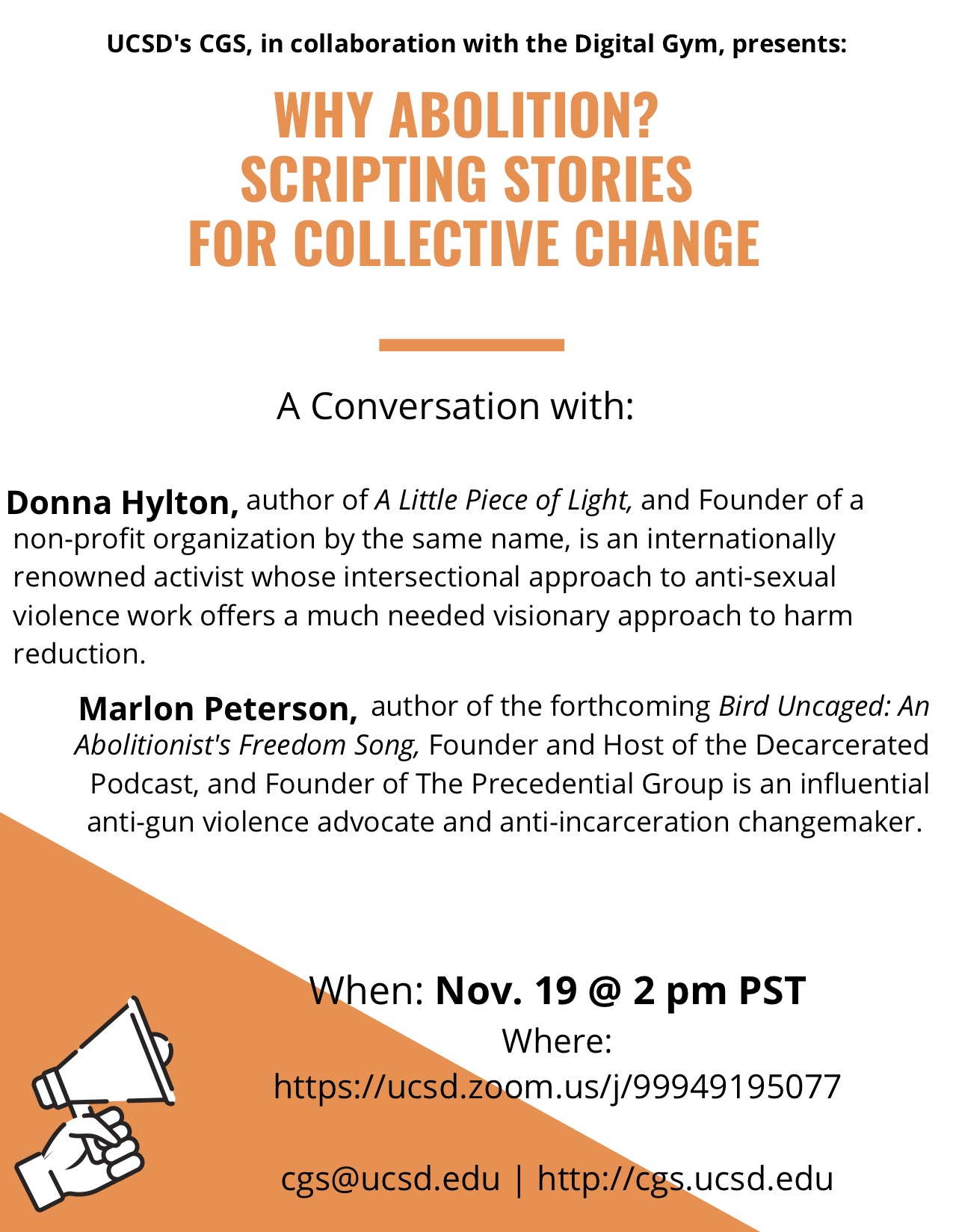 UCSD's Critical Gender Studies Program, in collaboration with the Digital Gym, invite you to 2020-2021 Virtual Community Series themed "Materializing Abolition: Queer and Feminist Strategies." The events are designed for audience members to learn more about abolition in its everyday and community work. This series offers insight on current transformative justice practices and principles, and is intended to think critically about the harms of prison and police structures while offering tools for community empowerment. Topics stem from queer and feminist engagements with embodiment, systemic and institutional violence, and subversive alternatives to enliven the very material work of abolition happening in the here and now.